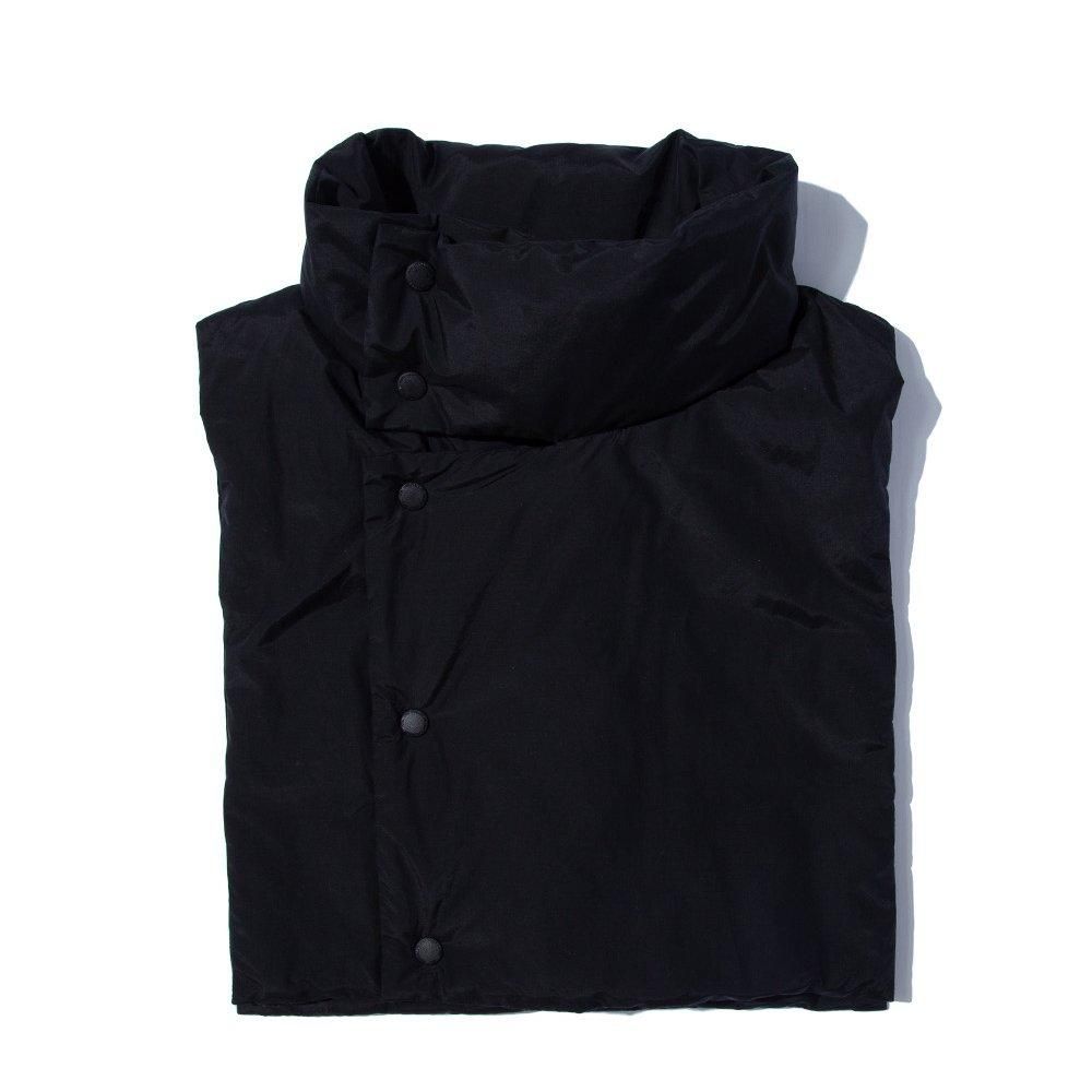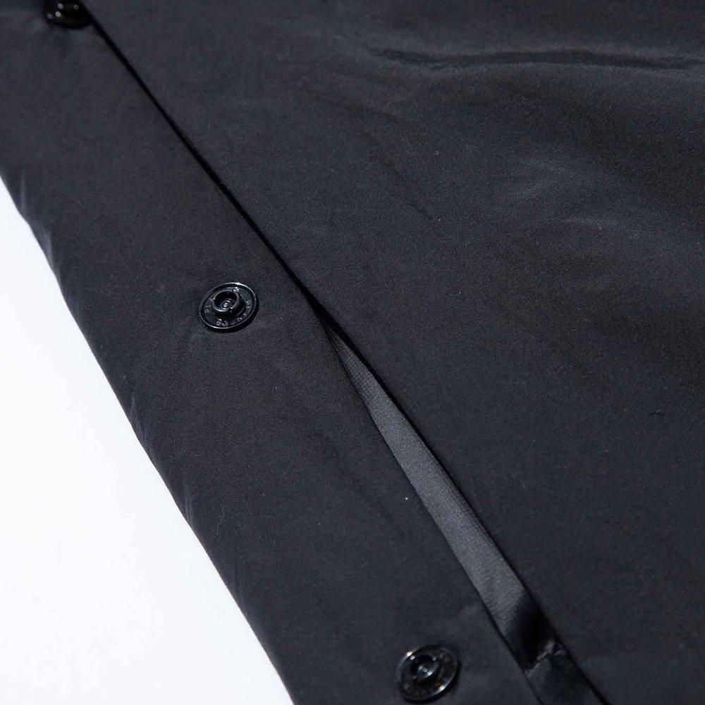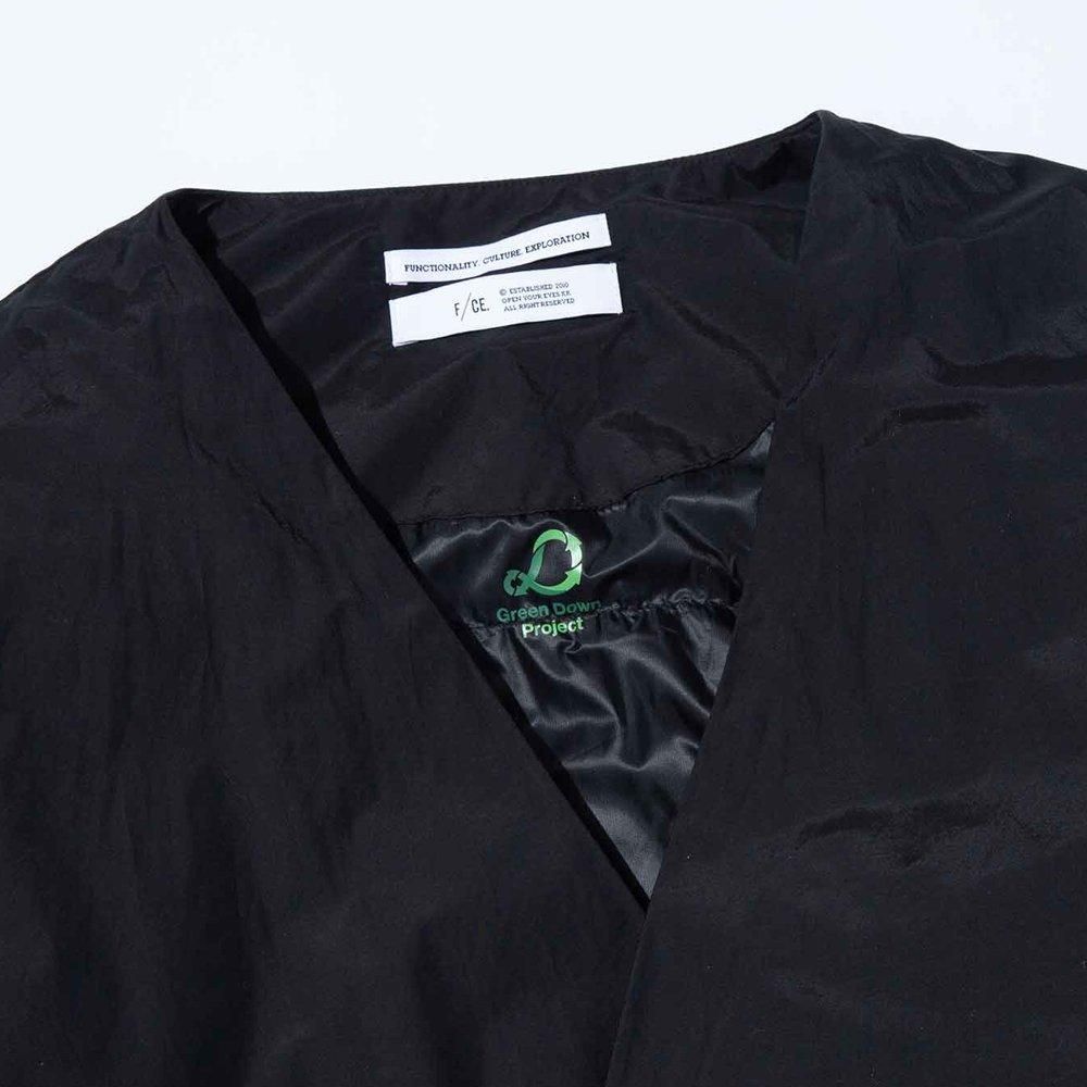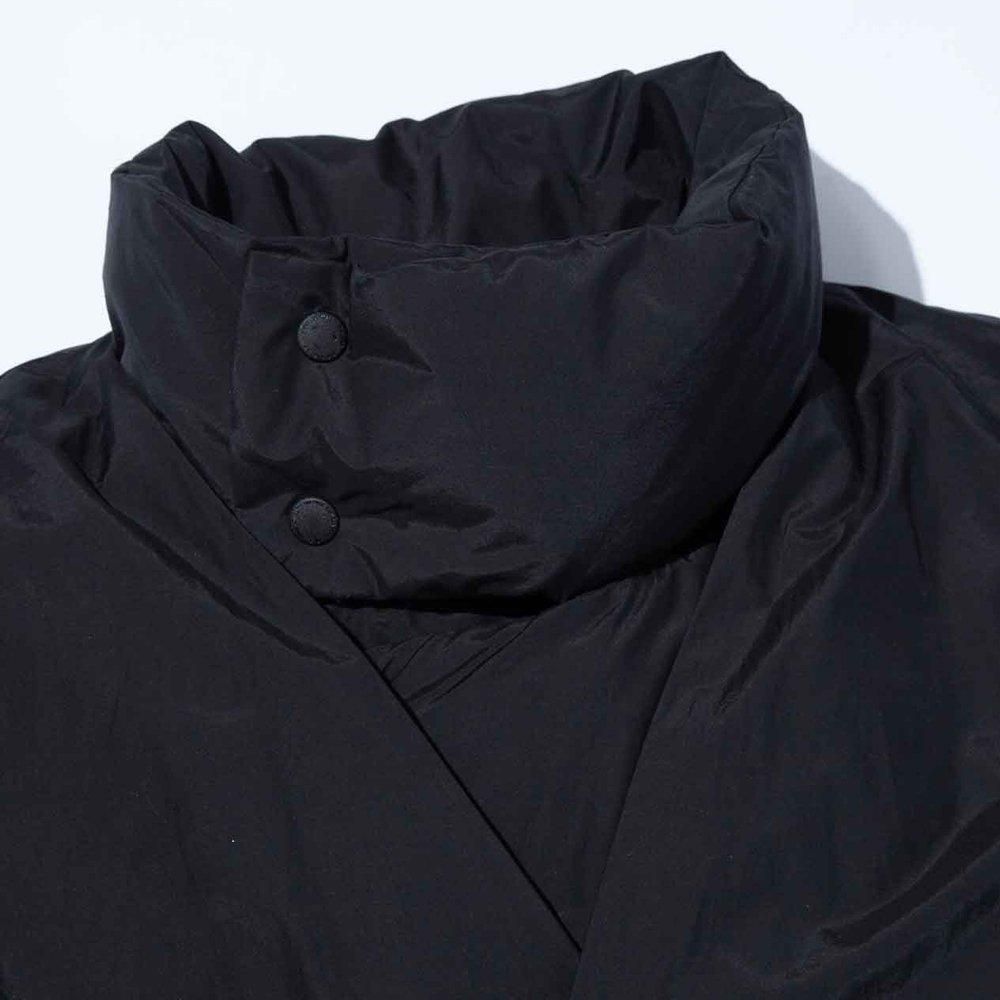 ジャケットや寝袋、布団から羽毛を回収し、丁寧に再洗浄された650フィルパワーのダウン、素材はリサイクルナイロンを使用した、Vカラーとスタンドカラーので着用可能な2WAYロングコート。