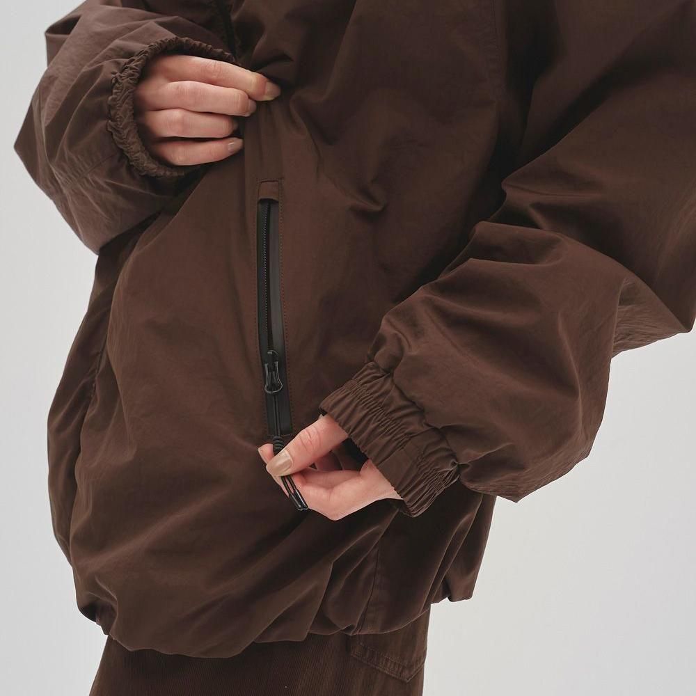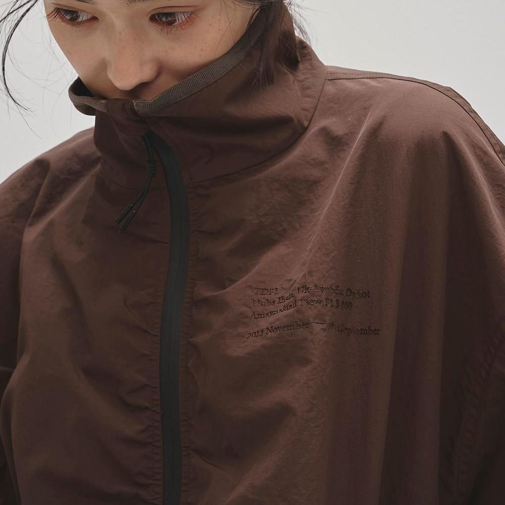 控えめな光沢感が特徴で、胸元のグラフィック刺繍や止水ファスナーがアクセントとなる一枚。