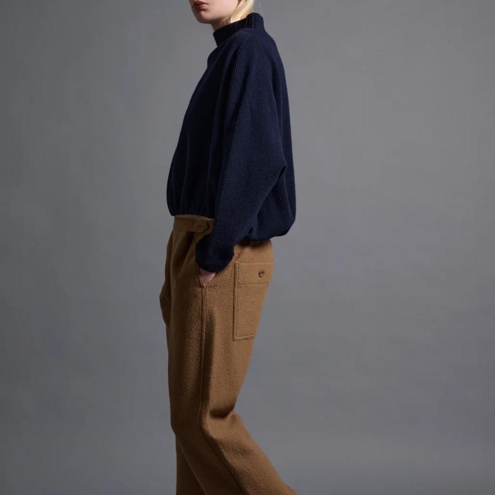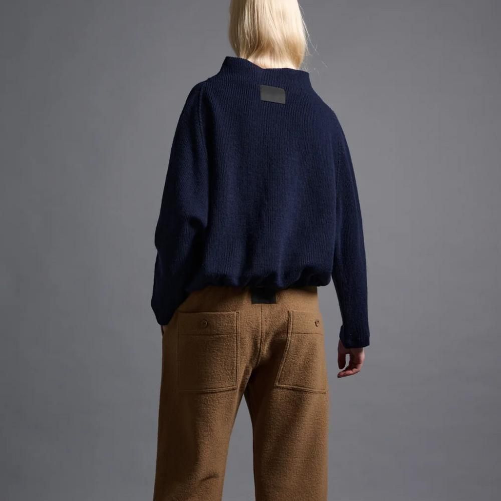 程よく立ち上がるボトルネックと細めの袖口がオーバーサイズでありながらコンパクトな印象を与えるトップです