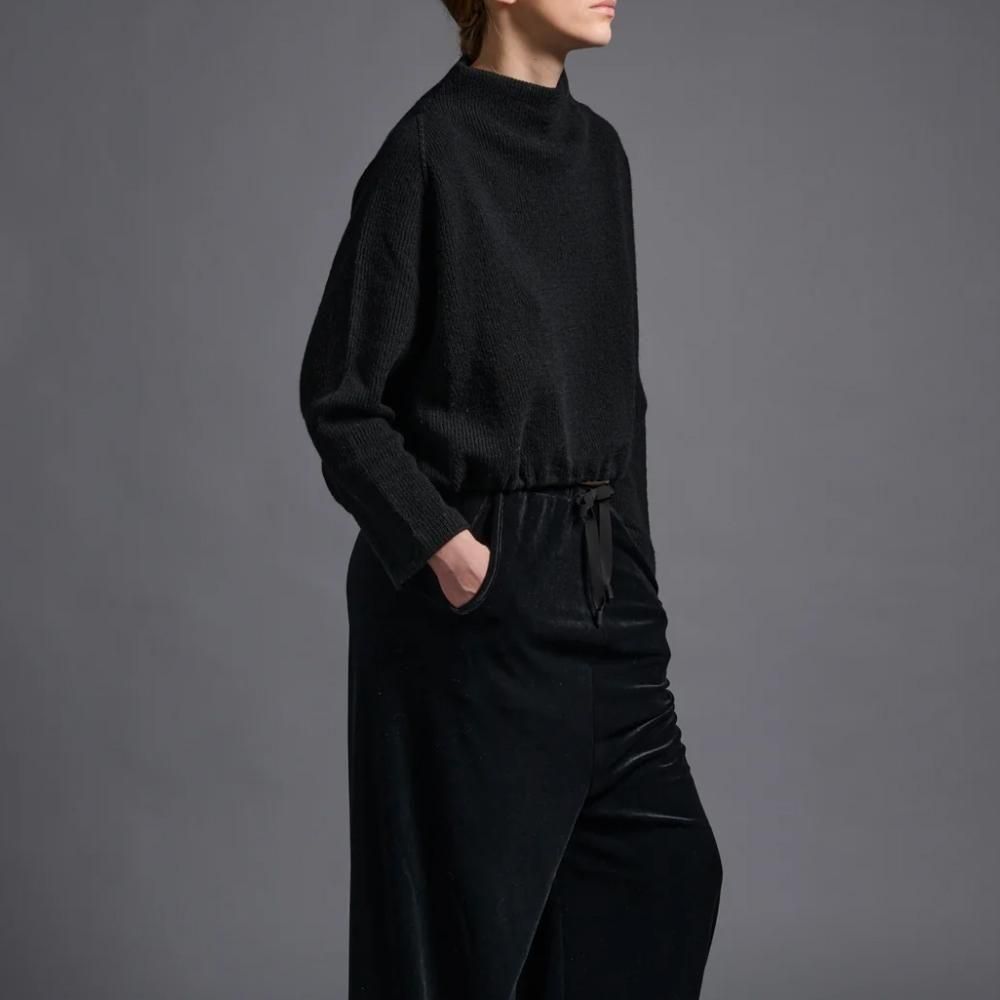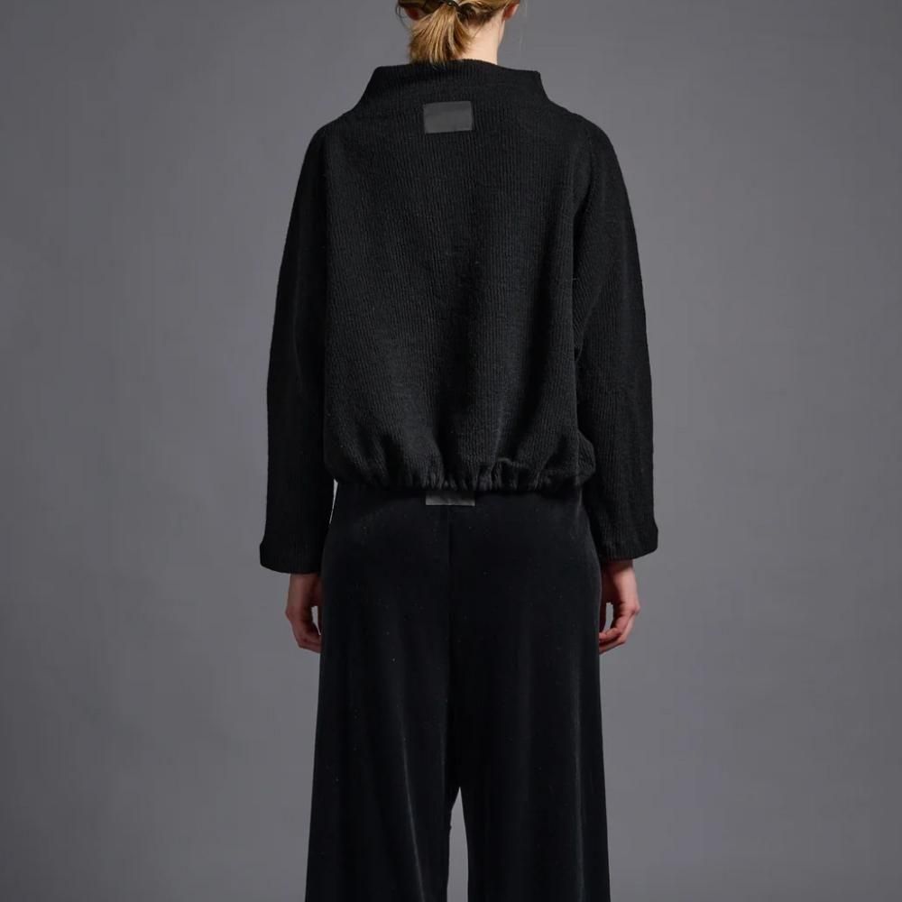 程よく立ち上がるボトルネックと細めの袖口がオーバーサイズでありながらコンパクトな印象を与えるトップです