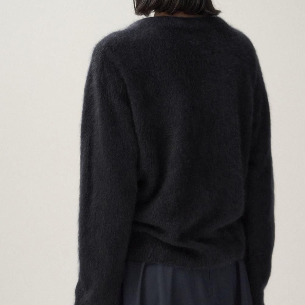 女性ならではのコンパクトなボディバランスの衿付きカーディガン。