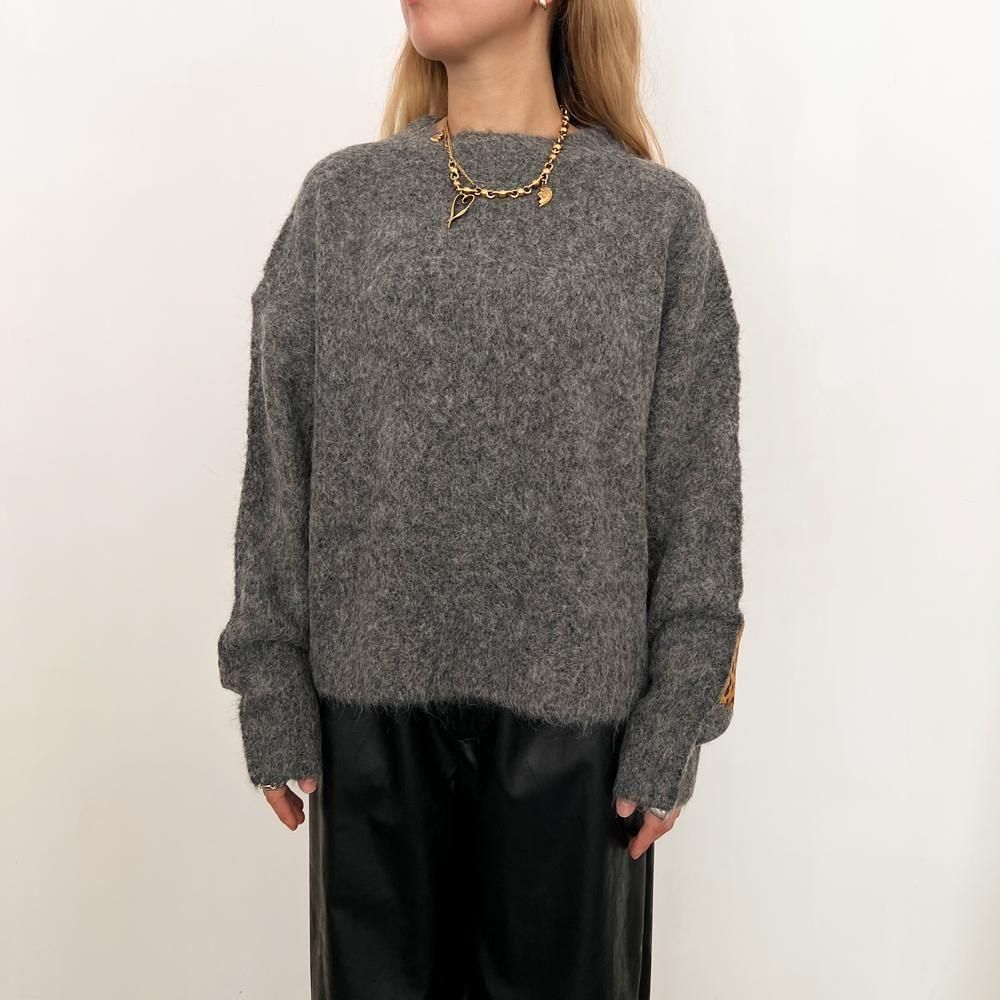 分厚すぎないシンプルデザインのニットにヒョウ柄の袖口パッチがポイントです!