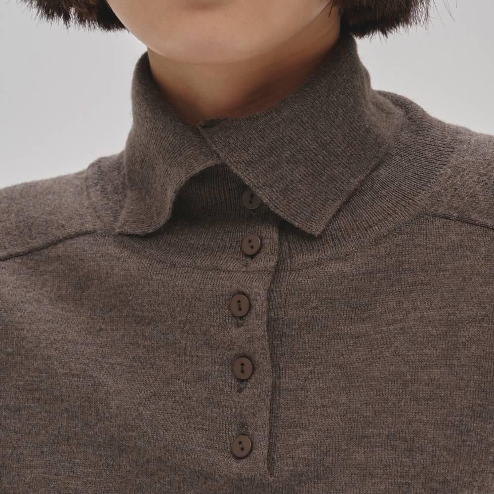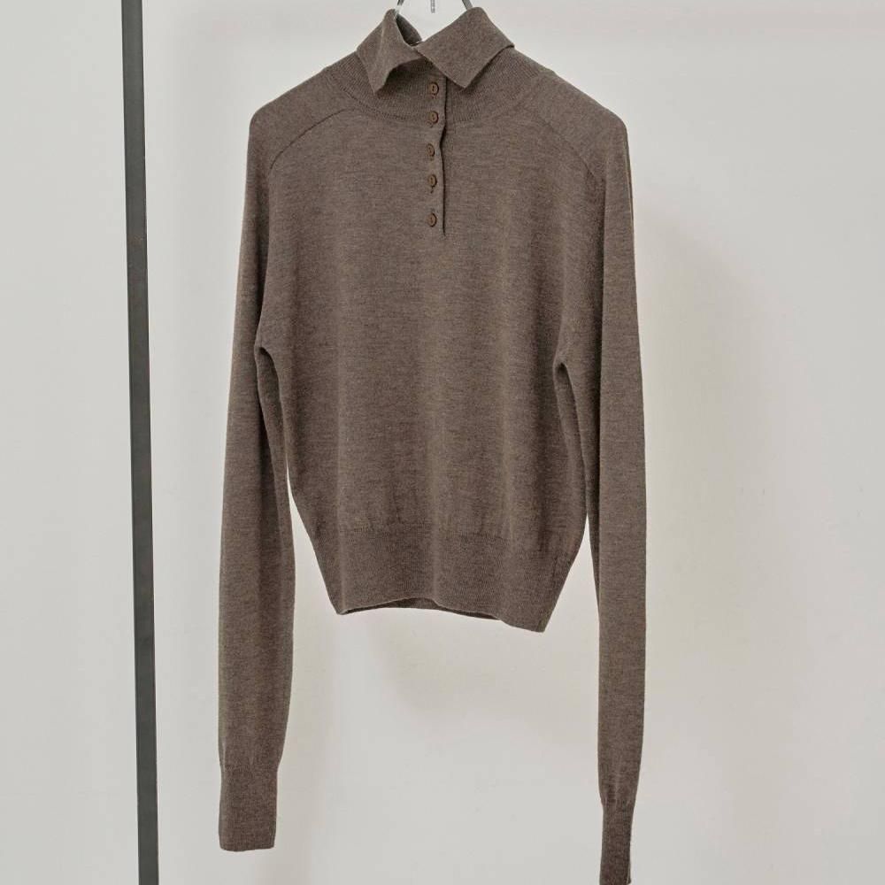 柔らかく、肌触りの良いメリノウール混糸で編み上げたニット。折り返したハイネックデザインと胸元までのフロントボタンが特徴です。すっきりと着用できるコンパクトなシルエットで、厚手ニットに重ねて、襟元のデザインをアクセントにした着こなしも楽しめます。