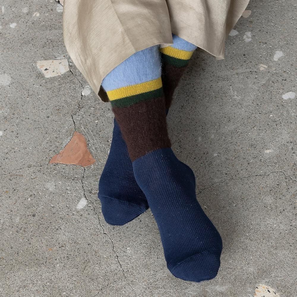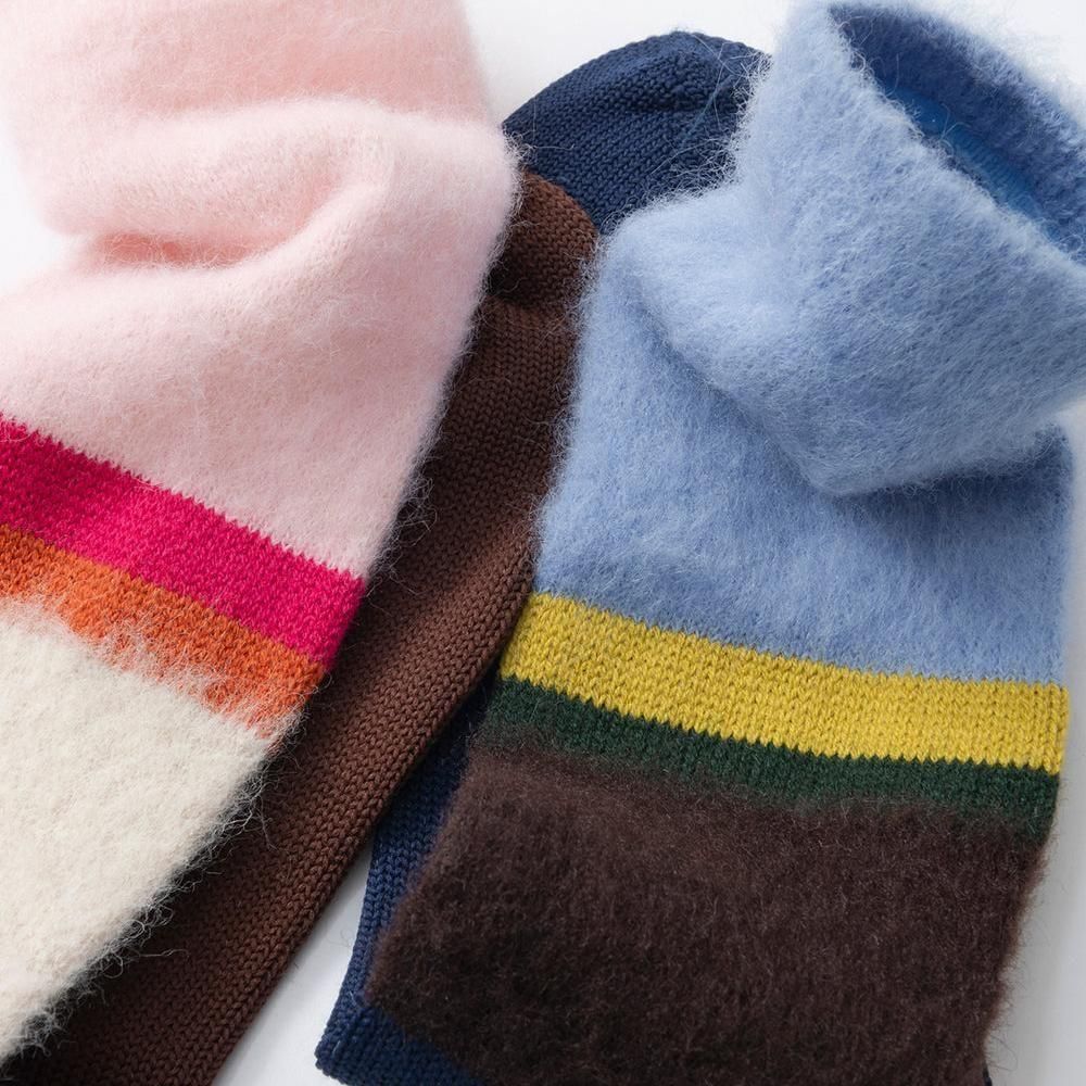 起毛素材を活かしたハイソックス。ファーの存在感が露出して靴下がメインになるアイテムです。ボーダーの切り替えがアクセントになっているデザインです。