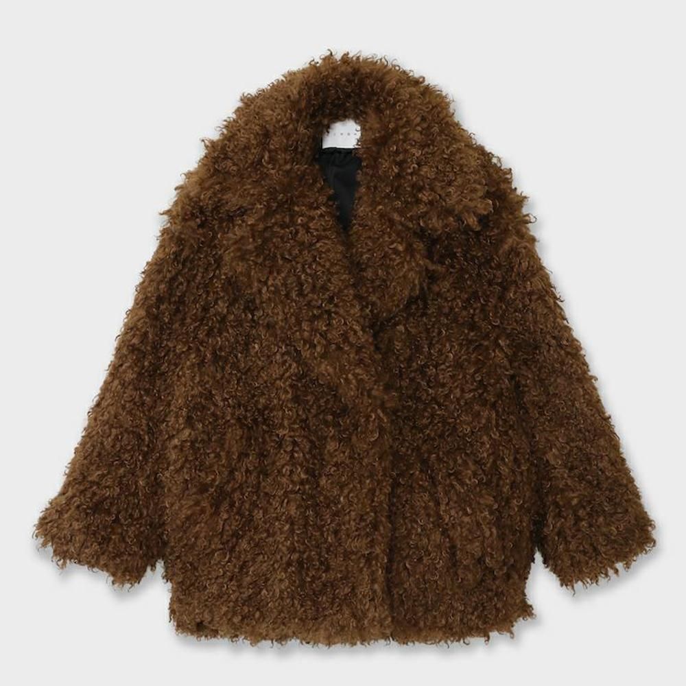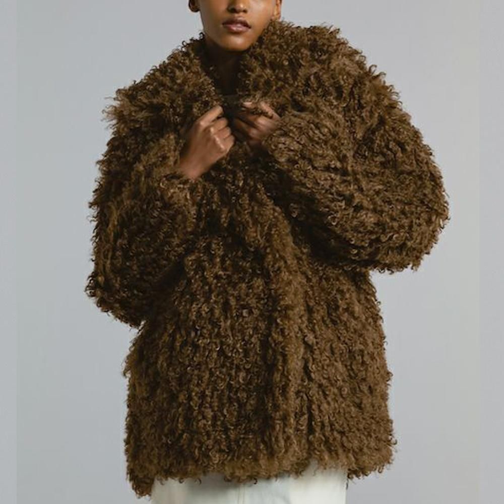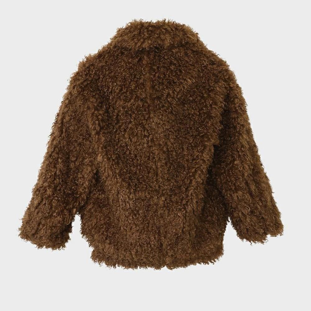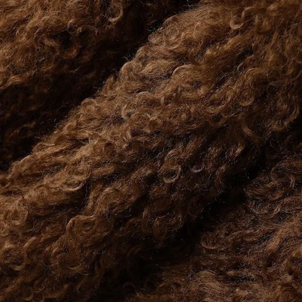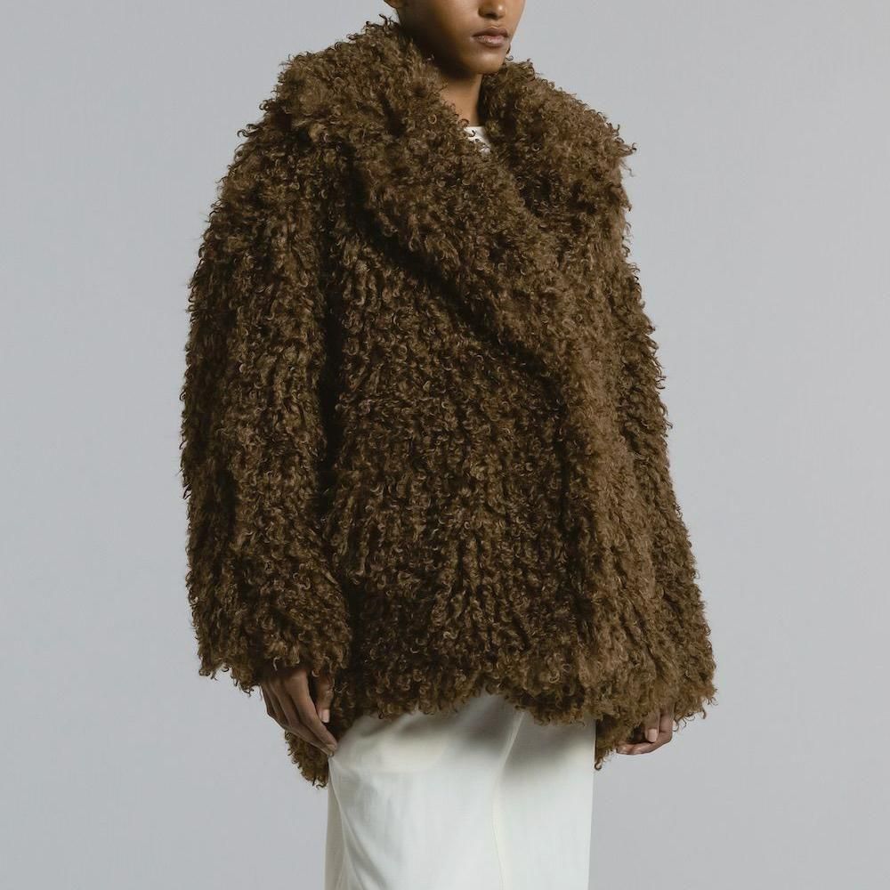 重厚感と高級感を併せ持つ、カールした毛足が特徴的なECOPEL社製リサイクルポリエステルファーを使用したミドル丈コート