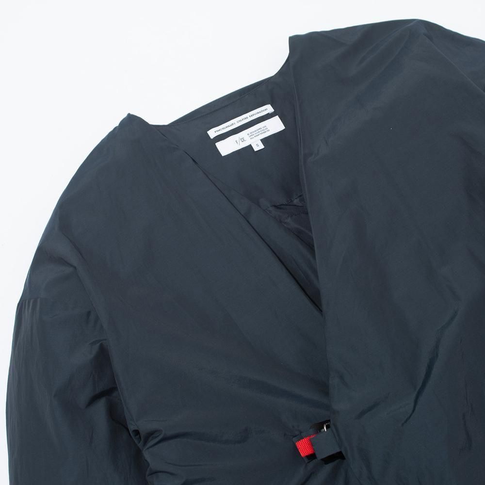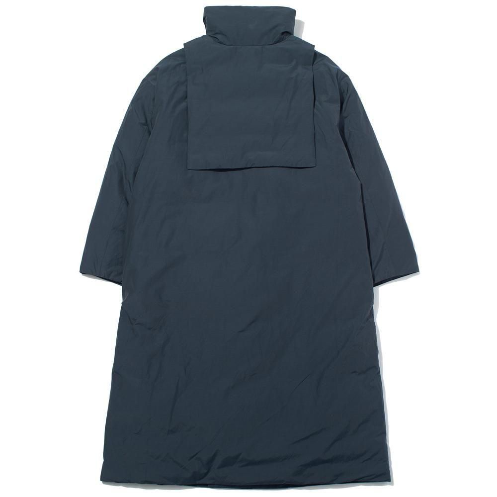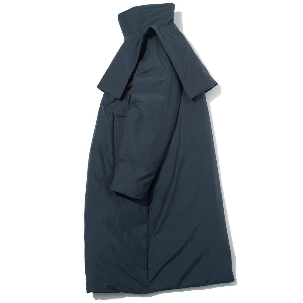 ジャケットや寝袋、布団から羽毛を回収し、丁寧に再洗浄された650フィルパワーのダウン、素材はリサイクルナイロンを使用した、Vカラーとスタンドカラーので着用可能な2WAYロングコート。