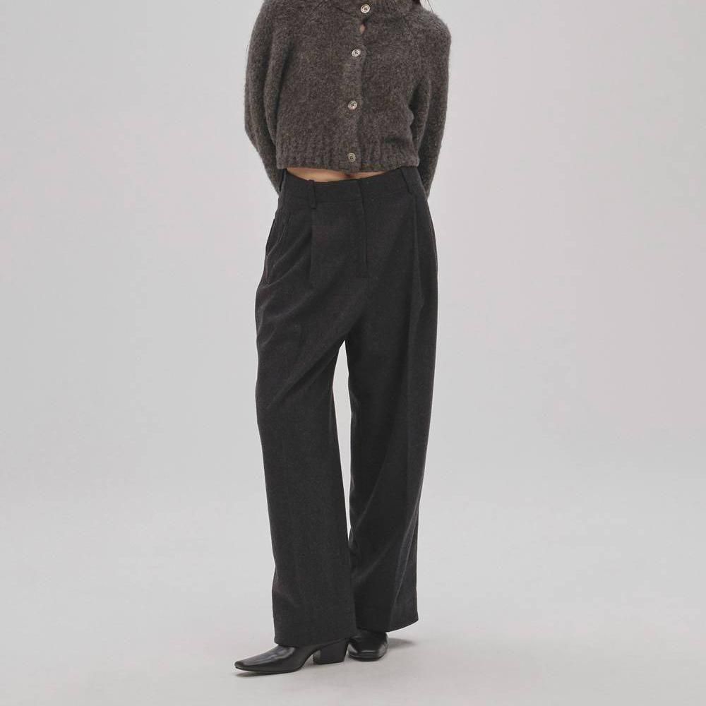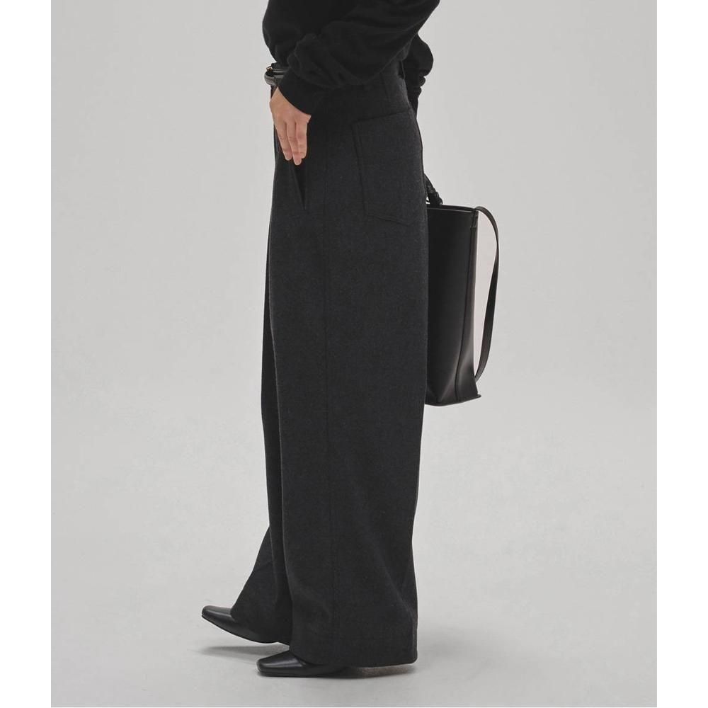 ミニマルなデザインのウエストラインや深めの股上にワイドなシルエットのバランスが魅力。